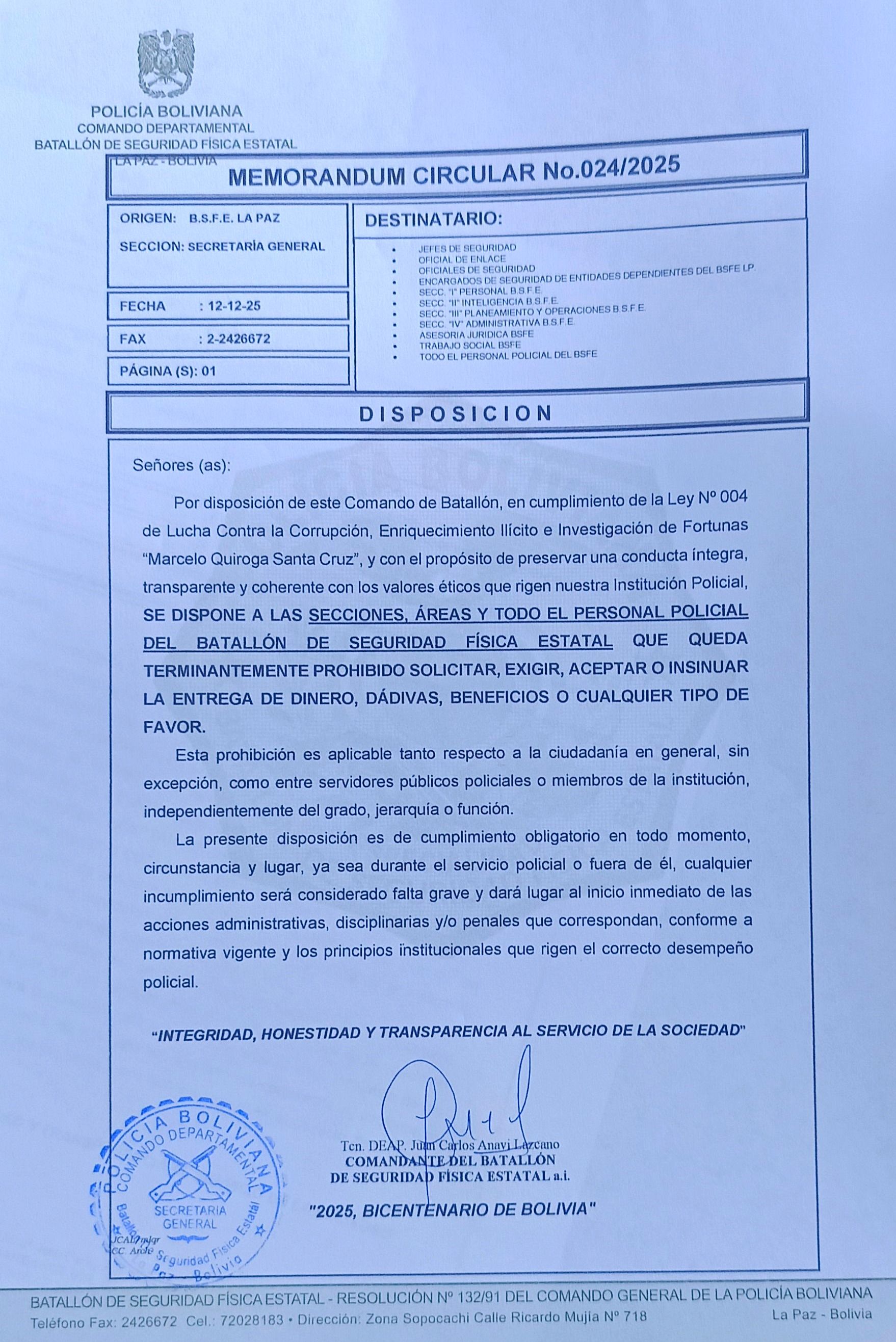 MEMORÁNDUM CIRCULAR 24/25 INTEGRIDAD, HONESTIDAD Y TRANSPARENCIA AL SERVICIO DE LA SOCIEDAD