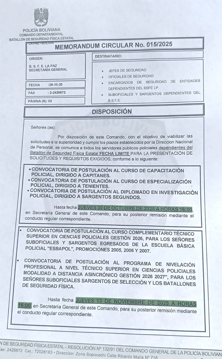 MEMORANDUM CIRCULAR 015/25 FECHAS LIMITE PARA PRESENTACION DE SOLICITUDES DE CONVOCATORIA EN EL BSFE